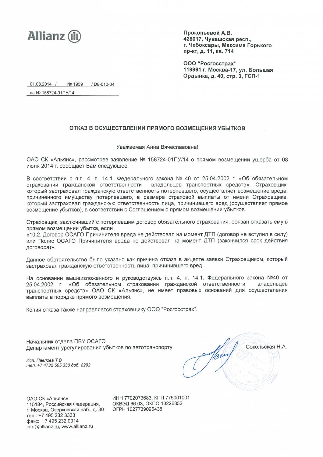 Я поняла, что отказ в прямом возмещении убытков, а полис не при чем и это просто отписка